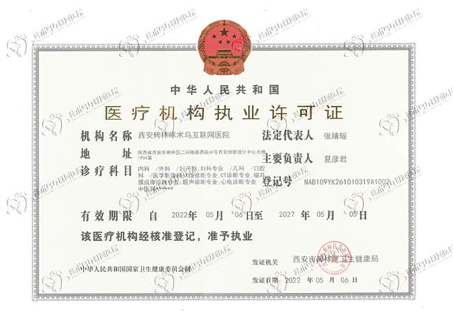 医院获碑林区首张互联网医院执业许可证,是国家高新技术企业、医保定点单位。全流程接受卫健、医保、公安监管。资质、医生均可官方查实。
